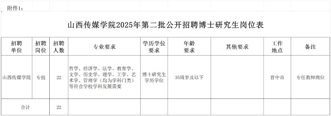 山西传媒学院2025年第二批公开招聘博士研究生22名,均为专业技术岗位。招聘岗位所需的具体条件以《山西传媒学院2025年第二批公开招聘博士研究生岗位表》(附件1)的要求为准。