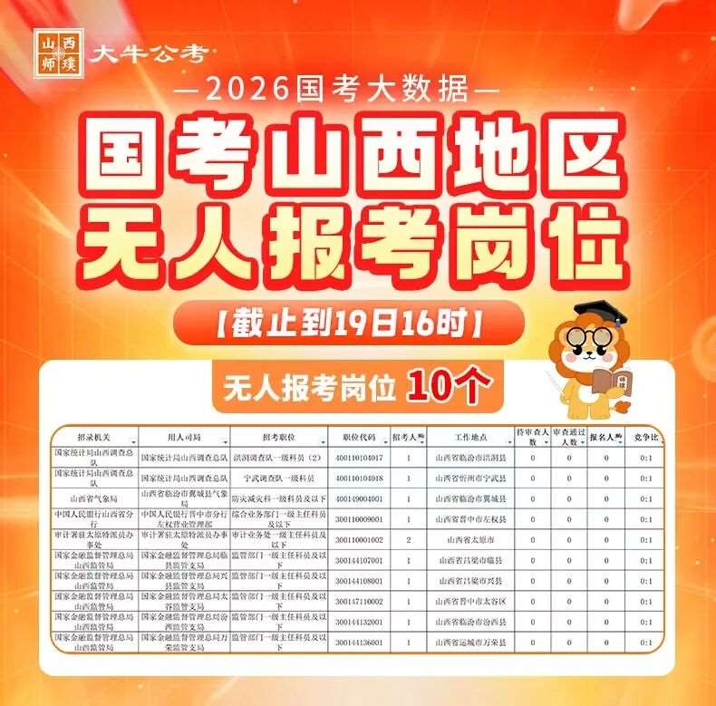 截至到19日17时,国考山西地区无人报考岗位共计10个,没有开始报名的考生可以多多关注这些无人报考的岗位,相对来说,这些岗位会竞争稍弱。