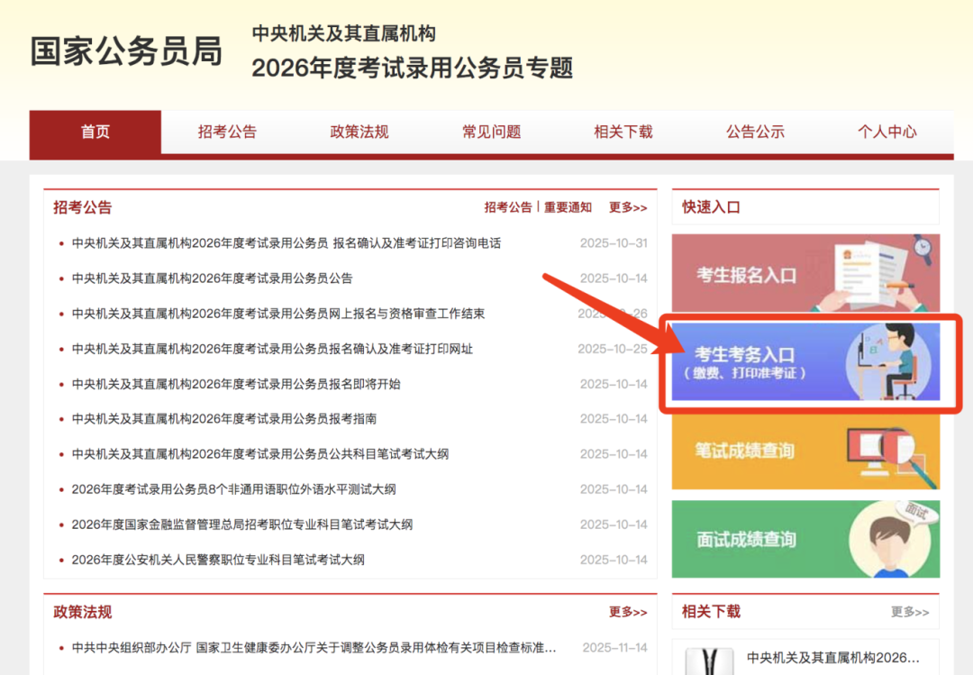 1.登录国家公务员局中央机关及其直属机构2026年度考试录用公务员专题网站。