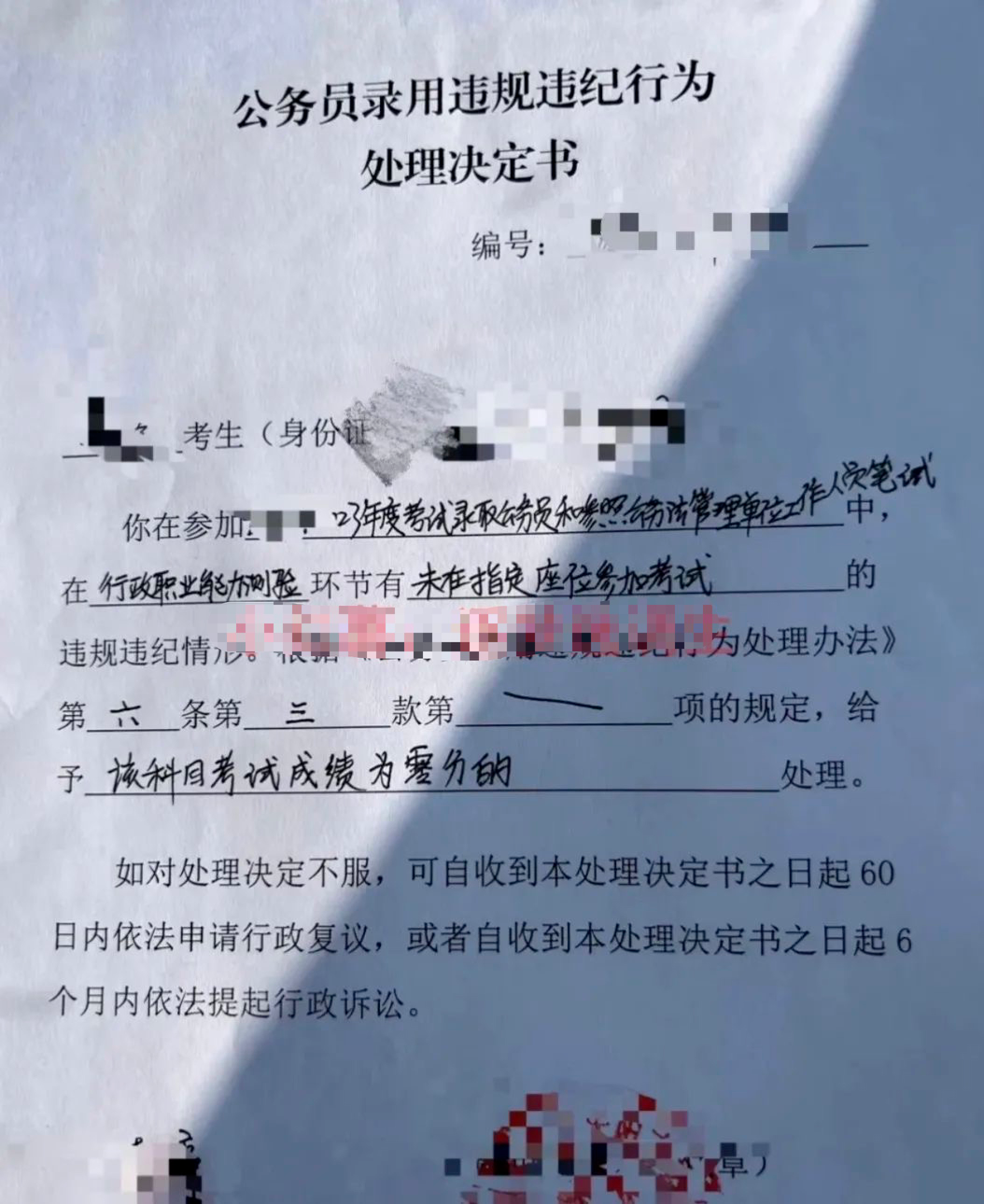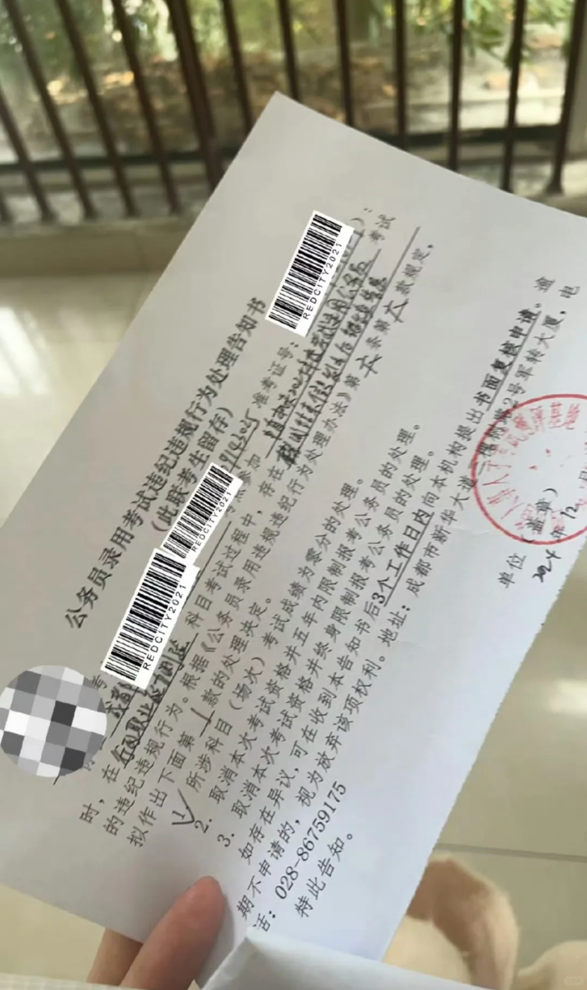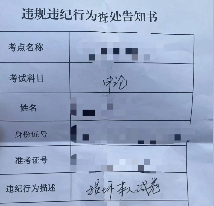 之前有网友晒出自己收到了2025年国考的笔试违纪通知及告知书,因其有在考试开始信号发出前答题的或者在考试结束信号发出后继续答题的行为,拟给予该科0分处理。