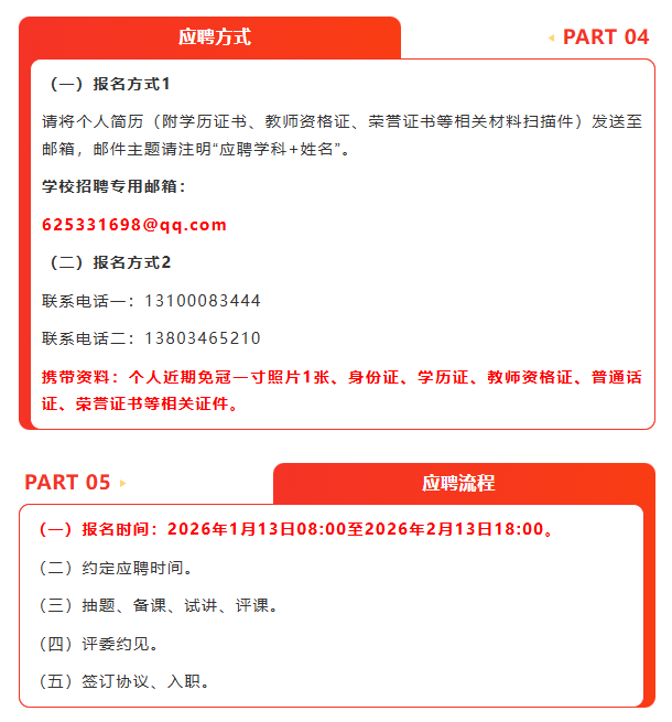 应聘教师基本功扎实,教学理念新颖,素养突出,沟通能力良好,管理能力优秀,既往教学*突出。有丰富教育教学经验的省市县级老师、优秀班主任和有大型民办学校工作经历者优先聘用。