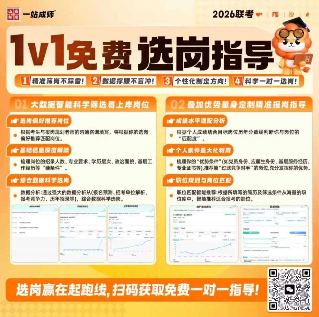 很多第一次参加考试可能看了选岗技巧还是一头雾水,没关系!山西师璞教师与公考雷达深度合作!1v1大数据免费智能选岗指导来救场!