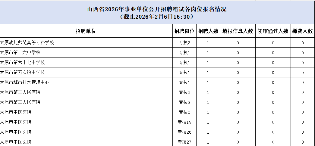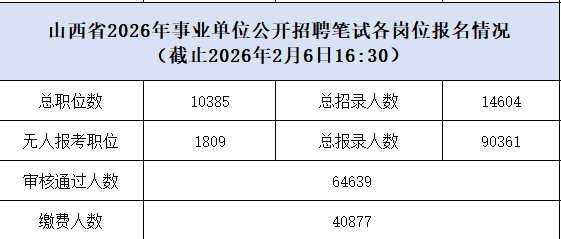 2026年山西事业单位联考提供10385个职位,共计招录公务员14604人。今天是山西联考报名第5天,截至2月6日16:30,全省报名人数达到90361人,审核通过人数64639人,缴费人数40877人。
