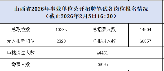 2026年山西事业单位联考提供10385个职位,共计招录公务员14604人。今天是山西联考报名第4天,截至2月5日16:30,全省报名人数达到66057人,审核通过人数44431人,缴费人数26695人。