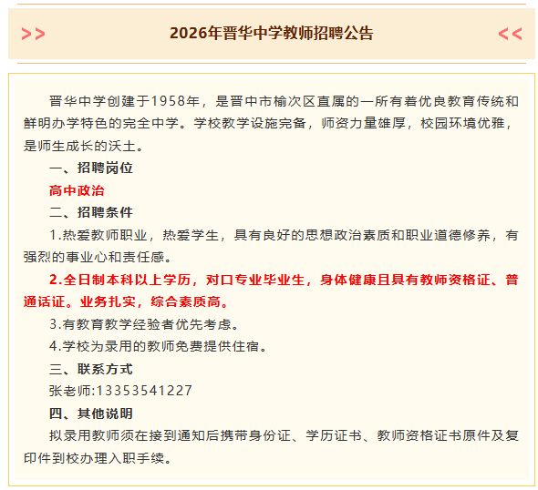 本科可报!26年晋中市榆次直属中学招聘高中教师公告!