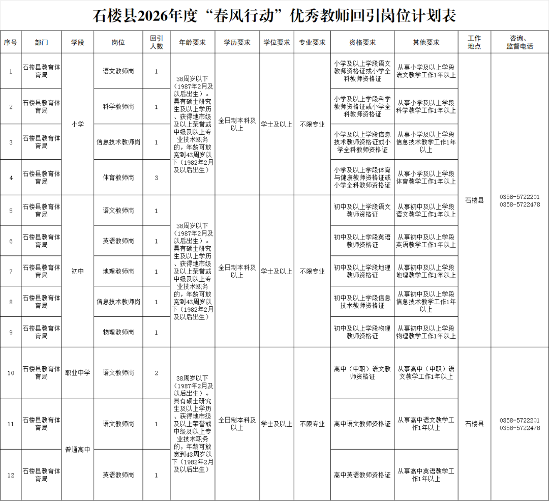 石楼县2026年度“春风行动”优秀教师回引工作领导组办公室对拟回引人员进行公示,公示时长为5个工作日,公示无异议的,按有关程序办理调动手续。
